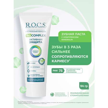 Паста зубная R.O.C.S. BIOCOMPLEX «Активная защита» рекомендована для постоянного ежедневного использования. Продукция ориентирована на уход за зрелой зубной эмалью, поэтому предназначена к использованию лицами старше 18 лет.