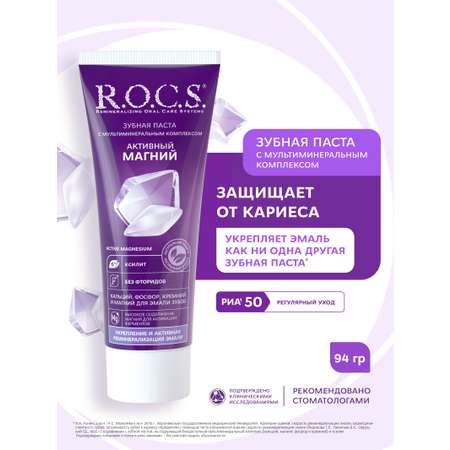 Уникальная реминерализирующая зубная паста R.O.C.S. «Активный Магний» обеспечивает лечебно-профилактическое воздействие и активно насыщает ткани ротовой полости необходимыми химическими элементами. Формула зубной пасты содержит высокую концентрацию магния, который является жизненно важным минералом и необходим для работы более чем 300 различных ферментов человеческого организма. Основная масса этого элемента содержится в клетках костей и зубов. Именно поэтому, для здоровья полости рта так важно поддерживать необходимый уровень магния. Кроме реминерализующей функции, паста ROCS «Активный Магний» качественно удаляет зубной налет, обеспечивает длительную чистоту, защищает от кариеса, нормализует микрофлору полости рта. Паста имеет безопасный состав, не содержит антисептики, фтор и синтетические красители.