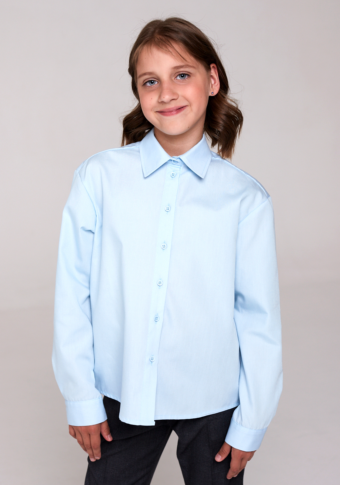 Классическая рубашка (блузка) голубого цвета - незаменимое решение для школьного гардероба. Прямая модель не стесняет движения, застежка на пуговицах, длинный рукав с манжетой, отложной воротничок. Универсальная модель, отличное решение на каждый день!