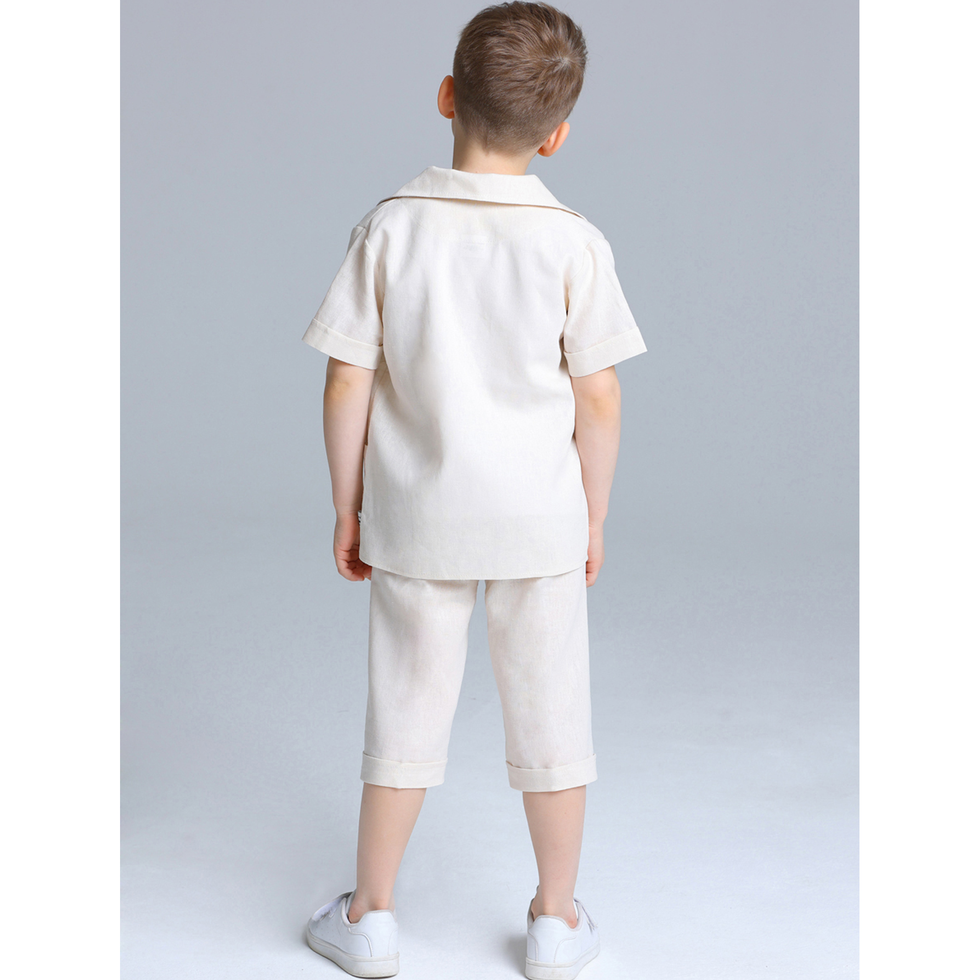 Костюм для мальчика выполнен из льняной ткани с содержанием вискозы. Мы специально выбрали ткань с таким составом, чтобы облегчить для покупателя уход за изделием. Комплект тройка майка, бриджи, пиджак не дает усадку изделия, хорошо гладится. Пиджак, с коротким рукавом застегивается на кнопки. На пиджаке имеются карманы. Удобные шорты бриджи с карманами, пояс на резинке. Футболка белая без рукавов выполнена из плотного трикотажного полотна 100% хлопок, имеется имитация кармана. Набор одежды для малышей идеально подходит для летних прогулок, походов в гости и путешествие, повседневной носки, игр в детском саду или в школе. Костюмчик - базовый гардероб для малышей модников, хит сезона. Футболку, рубашку, шорты можно носить как вместе, так и отдельно.