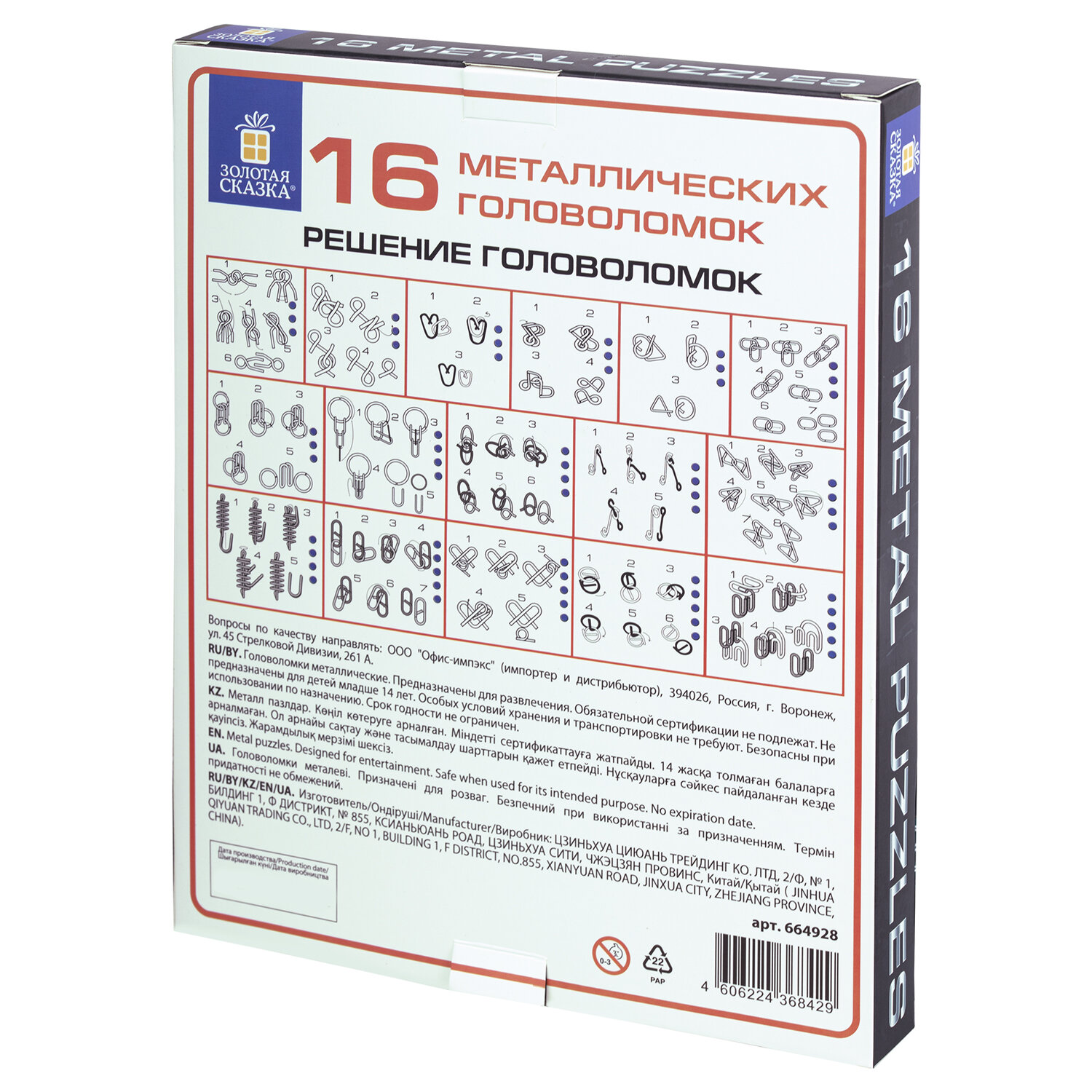 "Откройте мир интеллектуальных развлечений с головоломками ЗОЛОТАЯ СКАЗКА! Этот набор из 16 металлических пазлов различных уровней сложности станет идеальным подарком для детей всех возрастов. Головоломки развивают внимательность, мышление, смекалку и мелкую моторику рук, что делает их прекрасными развивающими игрушками.