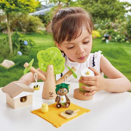 Набор включает в себя: Пчелы, улей, 1 дерево акации, 2 маленькие пчелы, 1 дозатор меда, 1 банка меда, 1 коврик, 1 сотовую рамку, 2 соты, 2 куска хлеба, 1 поднос для тостов, и одну фигурку. Этот интерактивный игровой набор позволяет малышам исследовать чудеса природы и даже играть роль голодной пчелы. Отлично подходит для воспитания ответственности и любви к миру природы. Для детей старше 3х лет.