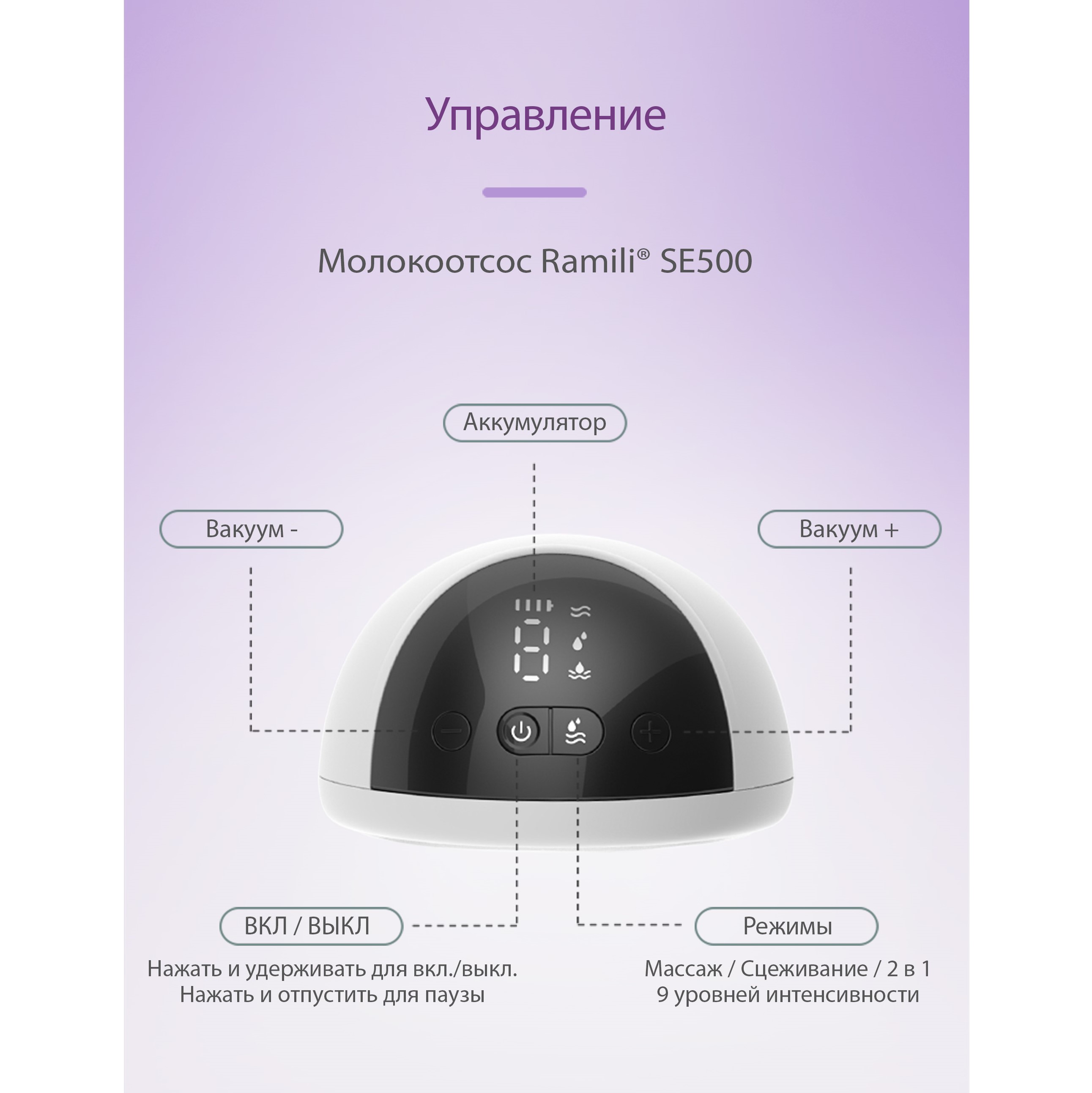 Известно, что грудное молоко – это лучшее питание для малыша. В молокоотсосах Ramili воплощены современные достижения, которые стали результатом сотрудничества с экспертами по грудному вскармливанию и с кормящими мамами, которые, так же, как и Вы, желают дать всё лучшее своим малышам. Молокоотсос позволяет обеспечить ребенка самым полноценным питанием. Молокоотсос позволяет сохранить материнское молоко в том случае, когда кормление грудью временно невозможно. Главная особенность молокоотсоса Ramili SE500 заключается в том, что он освобождает руки, обеспечивая при этом комфорт процесса сцеживания. Поддерживается при помощи вашего бюстгальтера и специальной пряжки из комплекта, корректирующей достаточный для молокоотсоса объем бюстгальтера. Молокоотсос Ramili SE500 компактный и работает без проводов, оснащен самыми передовыми функциями и обладает важными особенностями для комфортного сцеживания в любое время: Освобождает руки во время сцеживания. «3D сцеживание» – специальная мягкая силиконовая насадка обеспечивает безболезненное комфортное сцеживание. В комплекте специальная корректирующая пряжка, которая обеспечивает достаточный объем бюстгальтера для комфортного расположения молокоотсоса. Двухфазный молокоотсос. Дополнительный комбинированный режим 2-в-1 (массаж + сцеживание). Закрытая система с защитой от обратного потока. Умный молокоотсос с функцией памяти. Работает от встроенного ёмкого аккумулятора. 9 уровней в фазе подготовки груди. 9 уровней в фазе сцеживания. Имитирует естественный ритм сосания ребенка. Молокоотсос легко использовать. В комплекте дополнительные вставки, корректирующие диаметр накладки на грудь, для индивидуальной адаптации. Молокоотсос оснащен плоским дном, его можно поставить на горизонтальной поверхности. Легко собирается и разбирается. Прост в управлении. Удобное расположение элементов управления. Оснащён сенсорным LCD-дисплеем с индикацией. Работает без проводов от ёмкого встроенного аккумулятора. Компактный и обладает лёгким весом. Тихая работа механизма. Удобный контейнер для молока 150 мл. Изготовлено из высококачественных материалов, не содержащих Бисфенол-А. Комфортный молокоотсоc. Молокоотсос так же оснащен третьим, комбинированным режимом 2-в-1, который объединяет в себе массаж и сцеживание.