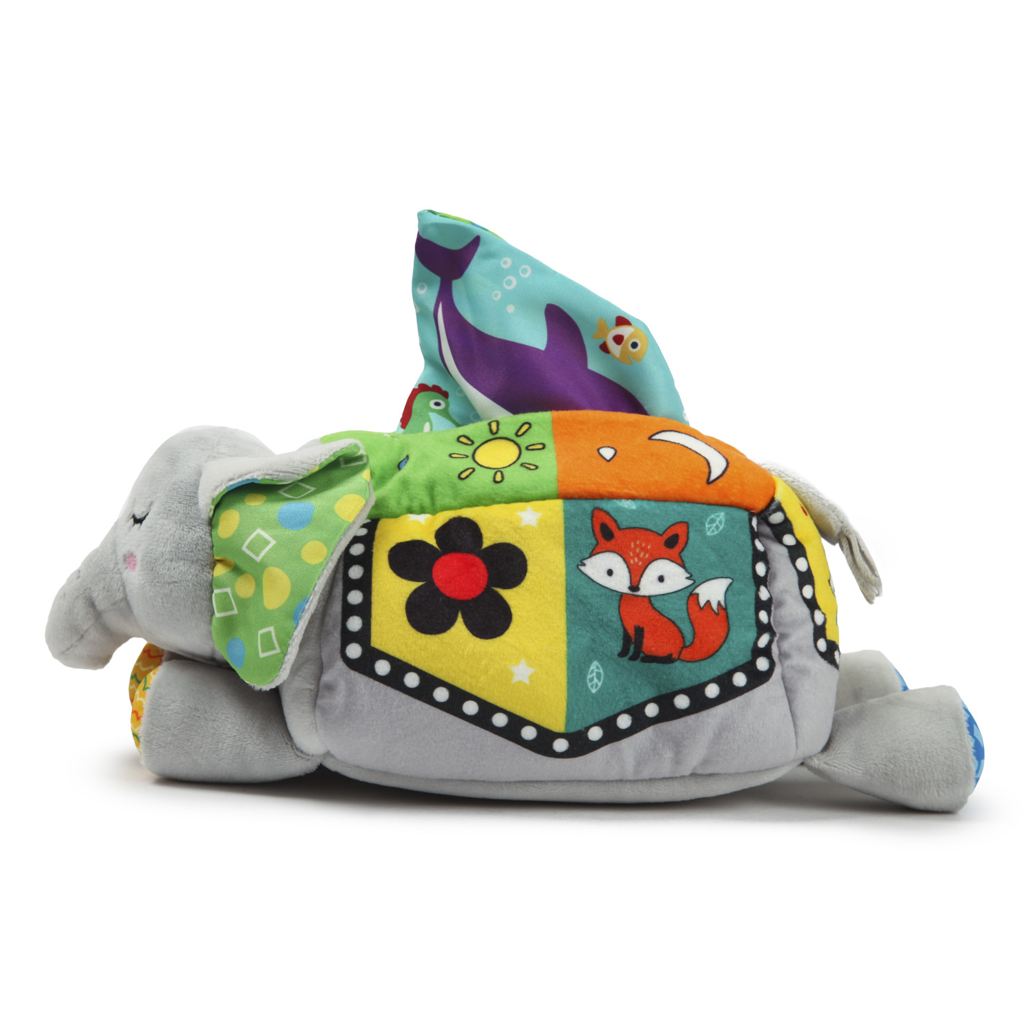 Слоник - не обыкновенная мягкая игрушка: в спине слона скрыто отверстие, в котором прячутся небольшие салфетки. Они сшиты из различных на ощупь тканей со всем разнообразием расцветок. Лицевая сторона каждого лоскутка украшена яркими картинками с изображением животных.