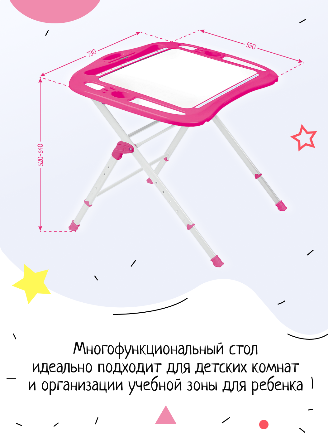 Растущий детский стол для организации места обучения и развития творческих способностей малышей. За детским столом-партой вашему ребенку будет удобно читать, писать и творить. Парта имеет 3 уровня наклона - развивающий стол поможет малышам сохранить правильную осанку во время длительных занятий. Растущий столик "растёт" вместе с малышом - легко подобрать нужную высоту ножек. Детский стол также может быть обеденной зоной в комнате. Стол отлично подойдёт в качестве подарка мальчикам и девочкам дошкольного и школьного возраста. Изделие изготовлено из качественных и безопасных материалов: каркасы выполнены из пластика и металла, столешница - из ЛДСП. Конструкция товара раскладная, она переносится и перевозится, а при хранении занимает очень мало места в квартире. Подойдет для детей от 3 до 12 лет.