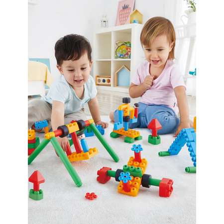 - Конструктор классный! Детали очень тактильно приятные, гибкий пластик, нет острых углов. Вставляются с небольшим усилием , держатся хорошо - постройками можно активно играть. Можно мыть в стиралке ) Покупала дочке на вырост, но уже сейчас потихоньку вставляет детали сама ( 1,3 г ) Старший 9 лет играет вовсю )) Есть интересные детали, колёса можно использовать по-разному, в комплекте наклейки для создания персонажей. Планирую докупить ещё, так как на двоих деталей маловато )