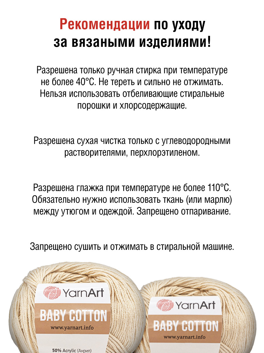 Хлопок в составе нити придает вязаным изделиям гигроскопичность, они комфортны к телу, не перегревают, но при этом сохраняют тепло в прохладную летнюю погоду. Благодаря акрилу изделия сохраняют форму, не дают усадки после стирки.