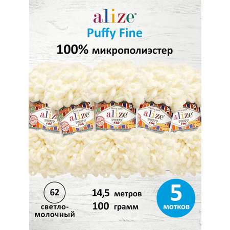 Пряжа для вязания Alize puffy fine 100 г 14.5 м микрополиэстер фантазийная мягкая 62 светло-молочный 5 мотков