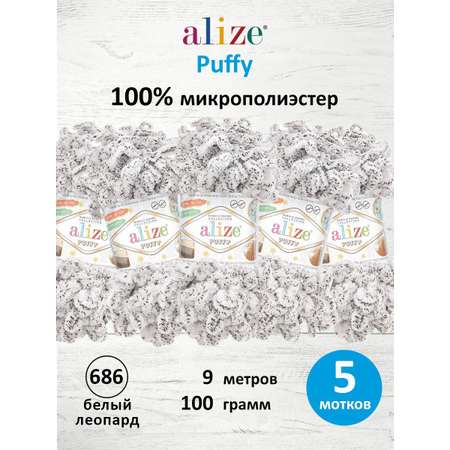 Пряжа для вязания Alize puffy 100 г 9 м микрополиэстер фантазийная плюшевая 686 белый леопард 5 мотков