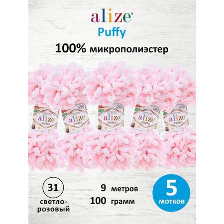 Пряжа для вязания Alize puffy 100 г 9 м микрополиэстер фантазийная плюшевая 31 св.розовый 5 мотков