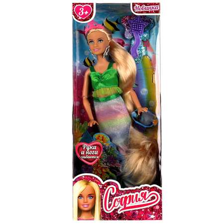 Прекрасная русалка София одета в блестящий зелёный топ с оборкой, а также серебристые серьги и розовую корону. Её радужный хвост красиво блестит и переливается. Одежду легко снять и надеть. С такой модной куклой девочке будет интересно и весело играть: благодаря тому, что руки и ноги куклы подвижны, им можно придать любое положение. У Софии длинные красивые волосы, которые хозяйка куклы может заплетать в разные причёски. Детально проработанный дизайн игрушки вдохновит девочку на новые игровые сюжеты.