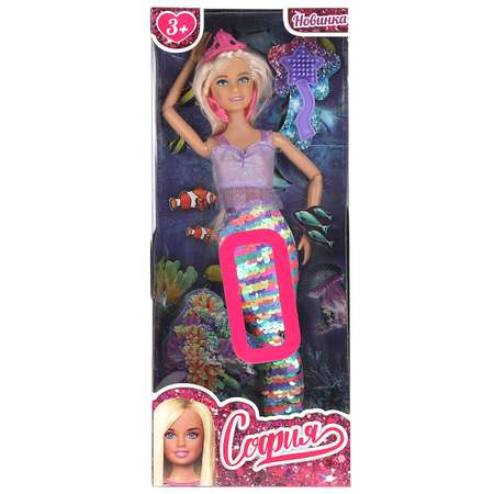 Прекрасная русалка София одета в блестящий сиреневый топ с оборкой, а также розовые серьги и корону. Её хвост с разноцветными пайетками красиво блестит и переливается. Одежду легко снять и надеть. С такой модной куклой девочке будет интересно и весело играть: благодаря тому, что руки и ноги куклы подвижны, им можно придать любое положение. У Софии длинные красивые радужные волосы, которые хозяйка куклы может заплетать в разные причёски. Детально проработанный дизайн игрушки вдохновит девочку на новые игровые сюжеты.