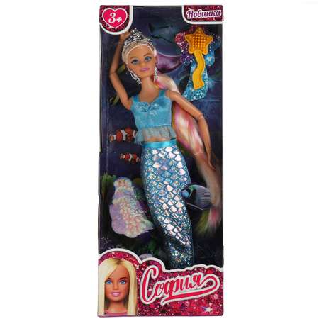 Прекрасная русалка София одета в блестящий голубой топ с оборкой, а также серебристые серьги и корону в тон. Её хвост с красивым узором голубого и сребристого цветов красиво блестит и переливается. Одежду легко снять и надеть. С такой модной куклой девочке будет интересно и весело играть: благодаря тому, что руки и ноги куклы подвижны, им можно придать любое положение. У Софии длинные красивые радужные волосы, которые хозяйка куклы может заплетать в разные причёски. Детально проработанный дизайн игрушки вдохновит девочку на новые игровые сюжеты.