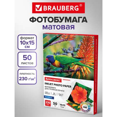 "Фотобумага матовая BRAUBERG ORIGINAL формата 10х15 см — идеальный выбор для качественной печати фото на струйных принтерах. Благодаря плотности 230 г/м2, эта фотобумага исключает просвечивание и гарантирует четкость изображений без бликов. Матовая поверхность придает изображениям бархатистую глубину, отлично подходит и для черно-белых снимков. Особый состав фотобумаги обеспечивает идеальную цветопередачу при печати водорастворимыми и пигментными чернилами. Вы можете использовать эту фото бумагу для профессиональной и любительской печати фотографий, а также рекламных материалов, брошюр и документов. Используется на струйных принтерах Epson, HP, Canon, Brothe.r Если вам нужна бумага для принтера формата А4 или фотобумага 10х15, этот вариант превосходно справится с задачей печати фото, сохраняя насыщенность и качество. Упаковка содержит 50 листов, что удобно для больших объемов печати. Выбирая бумагу для фото матовую, вы получаете профессиональный результат и яркие воспоминания, которые останутся с вами навсегда.