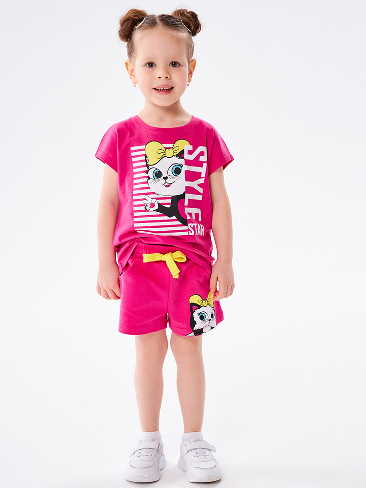 Детский трикотажный костюм для девочки: футболка с коротким рукавом и шорты. Производство Китай. Состав: Футболка: 100% Хлопок, Шорты: 100% ХЛопок