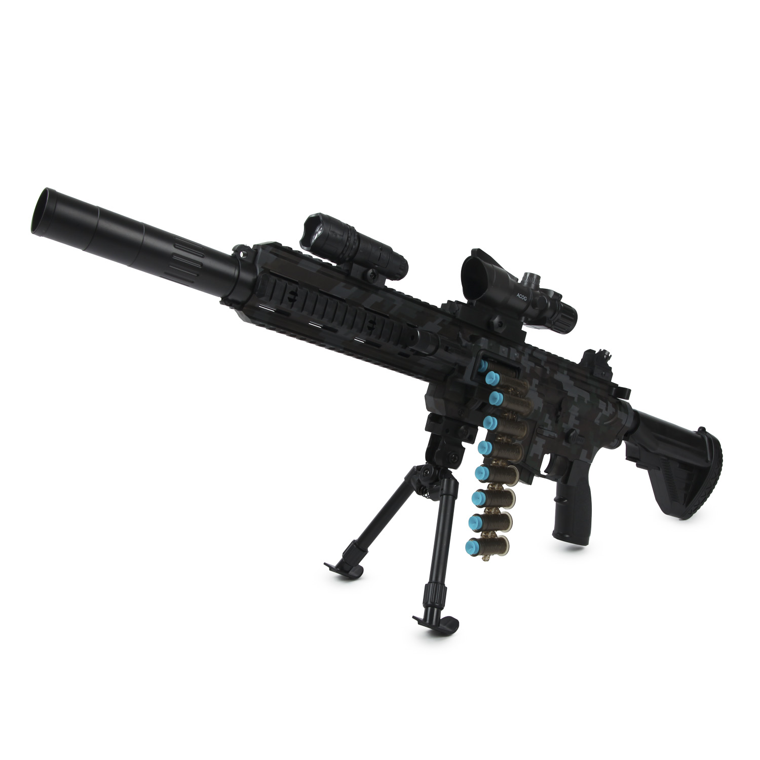 Оружие имеет оптический и световой прицелы с ручками-регуляторами. А также есть фонарик, который можно прикрепить на пулемет. У бластера 1 режим стрельбы при котором подача пуль осуществляется с помощью пулеметной ленты. Пулемет стреляет мягкими поролоновыми патронами с пластиковым наконечником. Дальность стрельбы до 25 метров.