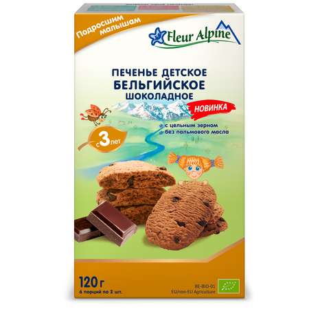 Детское печенье БЕЛЬГИЙСКОЕ ШОКОЛАДНОЕ Fleur Alpine имеет необыкновенный умеренно сладкий вкус, сравнимый с домашней выпечкой, и аромат какао. Таящее во рту печенье с кусочками бельгийского шоколада вызовет восторг даже у тех детей и взрослых, которым трудно угодить в угощении. Без пальмового масла. Выпекается с использованием подсолнечного и какао-масел. В составе шоколадная крошка, цельнозерновая мука, нерафинированный тростниковый сахар.
