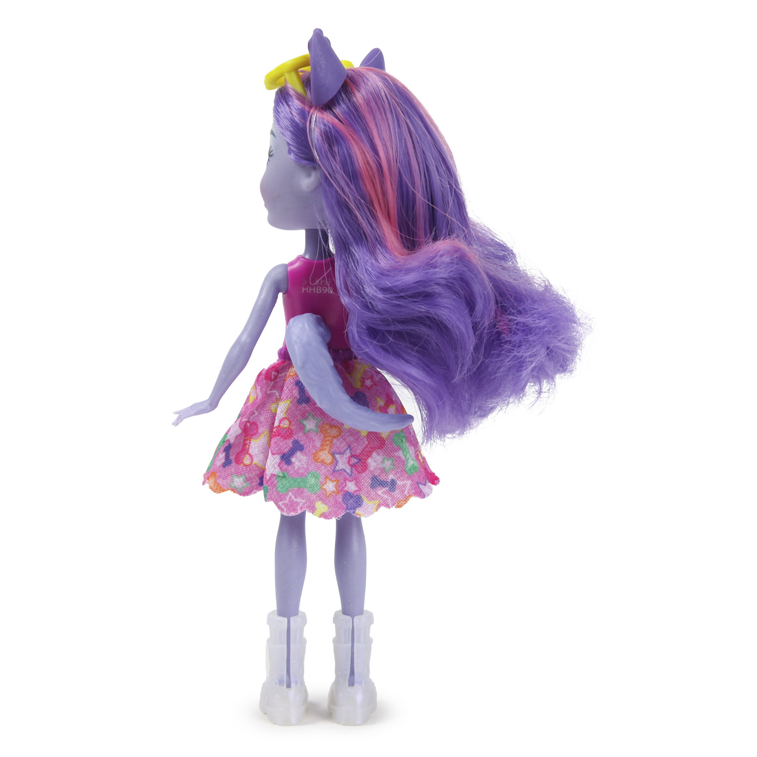 Кукла очень яркая, представлена в образе собачки. Фиолетовые волосы с розовыми прядями можно расчесывать и укладывать в стильные прически. На куколке топ с принтом в виде комбинезона. Юбка покрыта узором из разноцветных косточек. Со стороны спины у куклы имеется хвост хаски. К костюму прилагаются желтые очки и белые ботфорты.