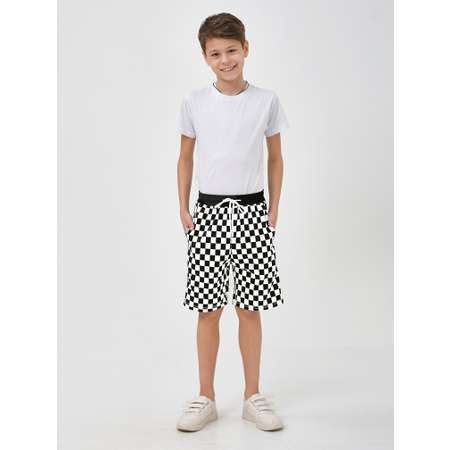 Трикотажные шорты для мальчика. Модель выполнена из петельчатого футера. Детали: - талия на резинке со шнурком; - два прорезных кармана; - сзади один накладной карман; - по бокам лампасы с надписями; - принт в клеточку.