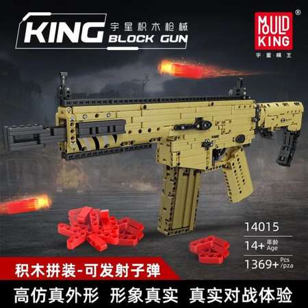Конструктор «Штурмовая винтовка «Скар» от фабрики Mould King серии Военное Оружие полностью совместим с Лего. Набор из 1369 деталей принадлежит к разделу «Военные», к категории «Оружие». Действующая копия бельгийского автомата спецназа песочного цвета очень реалистична: массивный приклад с упором и регулируемой длиной, действующий пусковой крючок, двойной прицел, отстегивающийся магазин, в который устанавливаются шесть патронов и выстреливаются с помощью специальных резинок. Пополняйте свою коллекцию Military с нашим брендом.