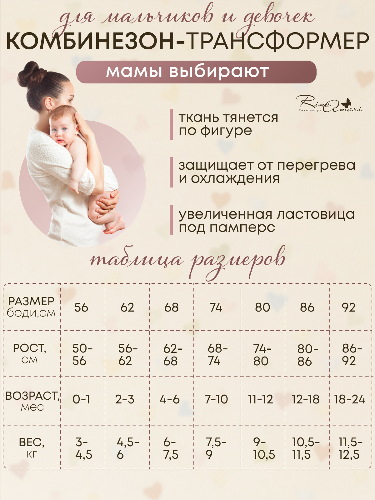 Комбинезон - трансформер — это детский нательный комбинезон с боковой молнией, с манжетой "трансформер". Вы можете сами выбирать открыть или закрыть ножку, тем самым малыш будет расти вместе с комбинезоном. Комбинезон представлен в размерах с 56 по 92.