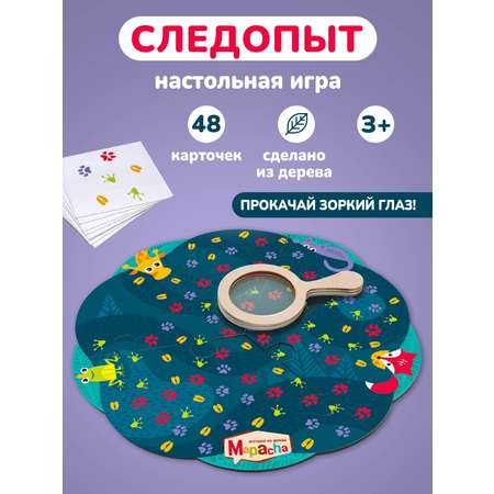 Детективная настольная игра развивашки для детей от 3 лет станет увлекательным развлечением для всей семьи. В комплект входит игровое поле из 3 деревянных фрагментов с пазловым замком, 48 карточек с iq заданиями и игровая лупа. На карточках изображены забавные следы животных: лисенка, лягушонка, жирафика и котенка. Задача игры — найти на поле комбинацию следов с выбранной карточки при помощи лупы.
