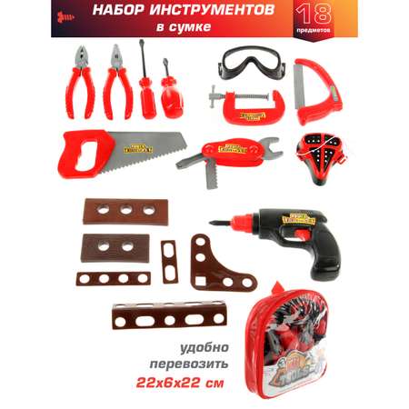 В комплекте игрушка респиратор, очки, игрушка ножовка, игрушка плоскогубцы, игрушка пассатижи, 2 отвертки, игрушка ручная пила, струбцина, мультитул, игрушка шуруповерт, 6 элементов для скрутки.