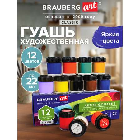 Гуашь художественная BRAUBERG ART CLASSIC — это профессиональный набор из 12 краскок для рисования, каждая в баночке по 22 мл, идеально подходящий для творчества как школьникам, так и художникам. Эти краски для рисования выделяются высокой укрывистостью и насыщенным цветом, обеспечивая гладкое и равномерное нанесение благодаря плотной текстуре. Быстро сохнущая гуашь сохраняет яркость и дает бархатисто-матовый финиш, при этом легко разбавляется водой. В набор входят белила, лимонная желтая, ультрамарин и другие оттенки, которые вдохновят на создание уникальных работ дома, в школе или на пленэре. Этот набор гуаши станет отличным выбором для канцелярии для школы и для тех, кто ищет качественные пальчиковые краски и художественные материалы. Создавайте шедевры, вдохновляясь великими мастерами, используя гуашь, которая раскрывает все грани рисования и творчества!