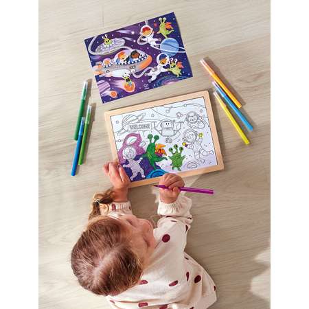Подходит для раскрашивания акварелью, цветными карандашами, красками, фломастерами и, даже, пальчиками. Соберите с ребёнком яркую картинку с отважными юными космонавтами, затем переверните её, и вы обнаружите новую картинку с контурами для раскрашивания. Ваш малыш узнает, как выглядит космос, забавные инопланетные существа и сможет раскрасить их по своему вкусу.