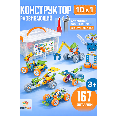 Из 167 деталей конструктора ребенок может собрать до 10 моделей машин по подробной инструкции по сборке: