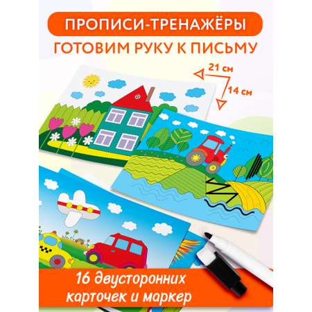 Благодаря набору многоразовых развивающих карточек ребёнок научится: проводить разные виды линий (короткие и длинные, прямые и наклонные, горизонтальные, вертикальные, волнистые линии, спирали и зигзаги); обводить по контуру; соединять по цифрам; рисовать по точкам; проходить лабиринты; штриховать. В игровой форме малыш будет познать окружающий мир и развивать творческие навыки.