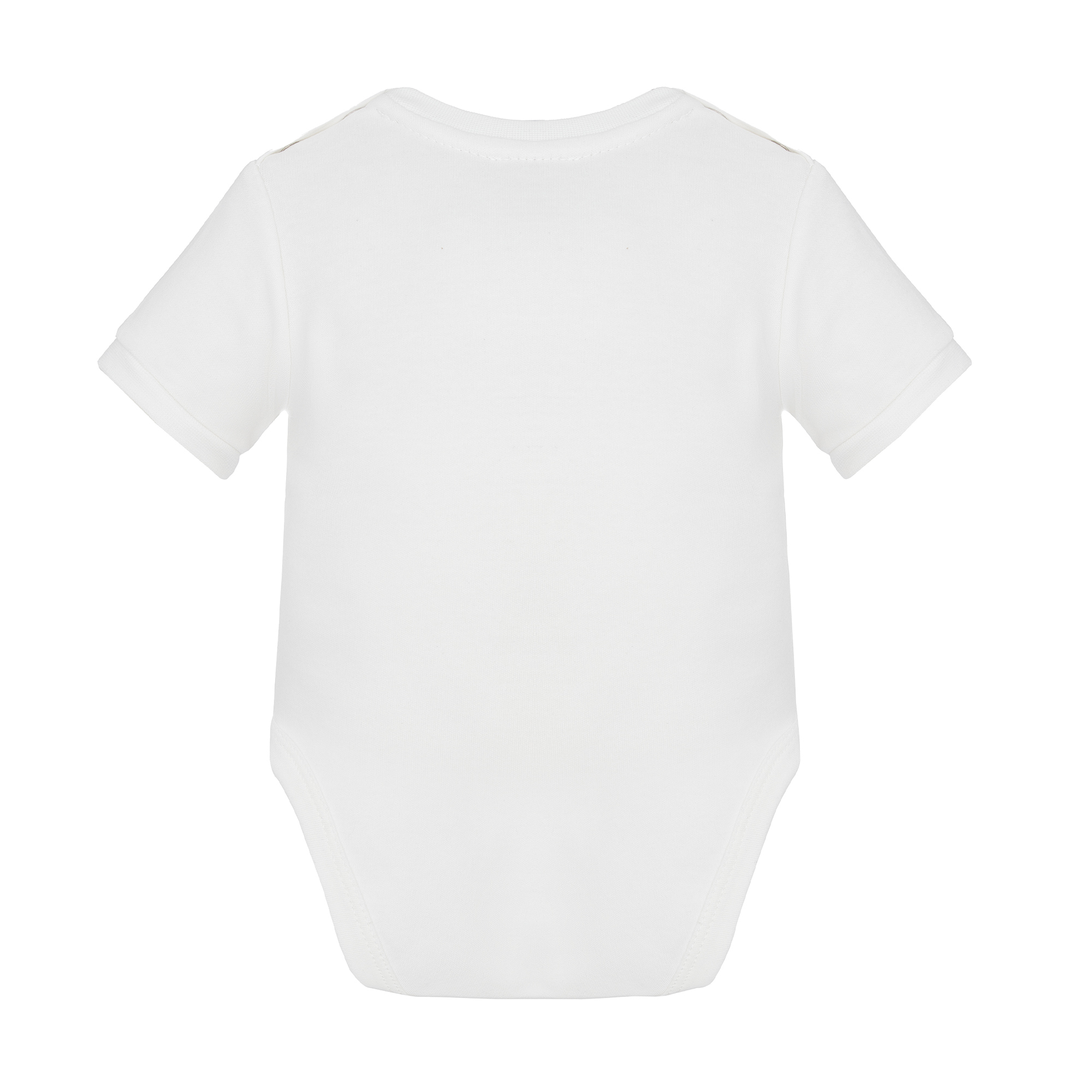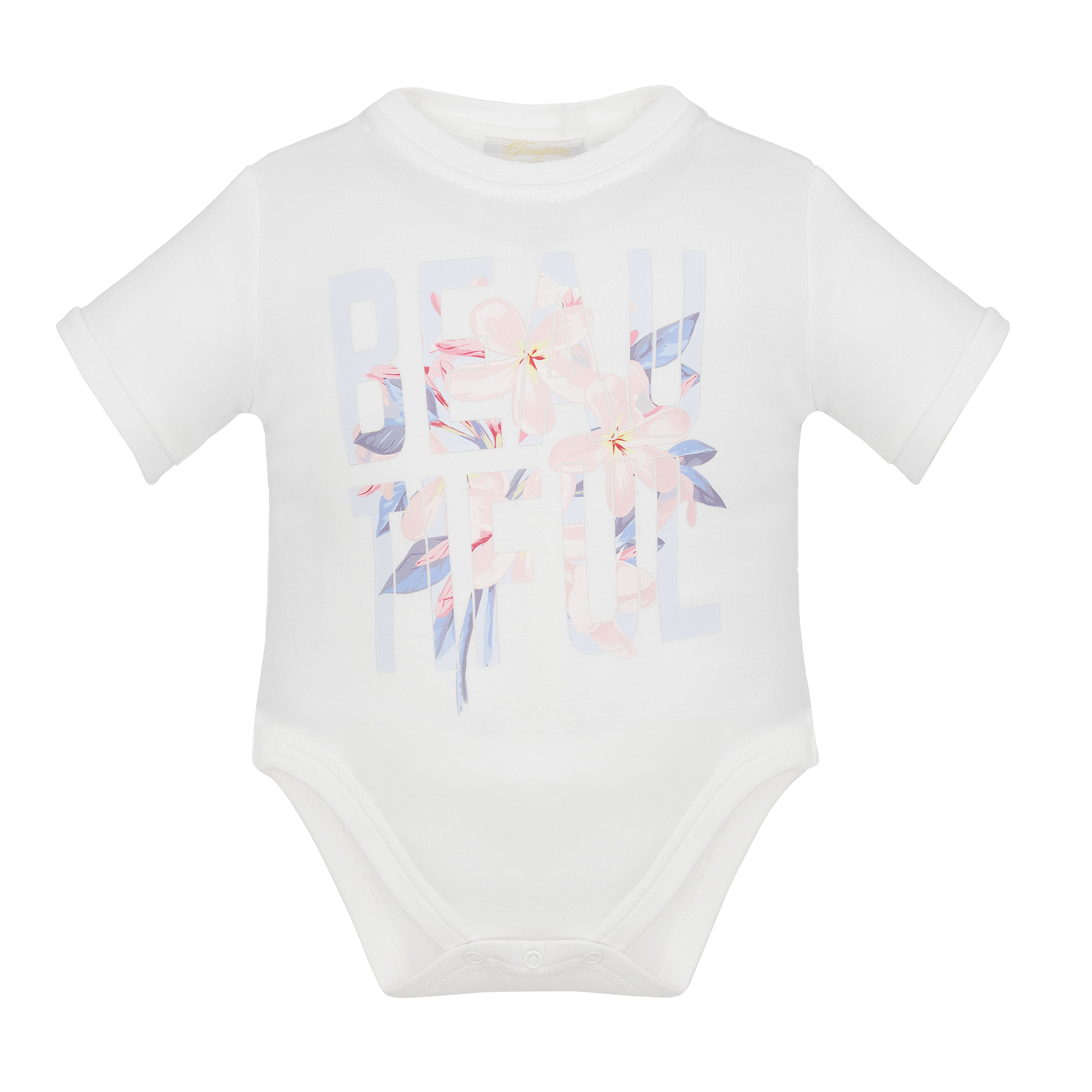 Чудесный боди для девочки прилегающего силуэта с короткими рукавами выполнен из натурального хлопка. Округлый вырез горловины обработан бейкой. На плечевых швах и по низу изделия расположены застежки кнопки.