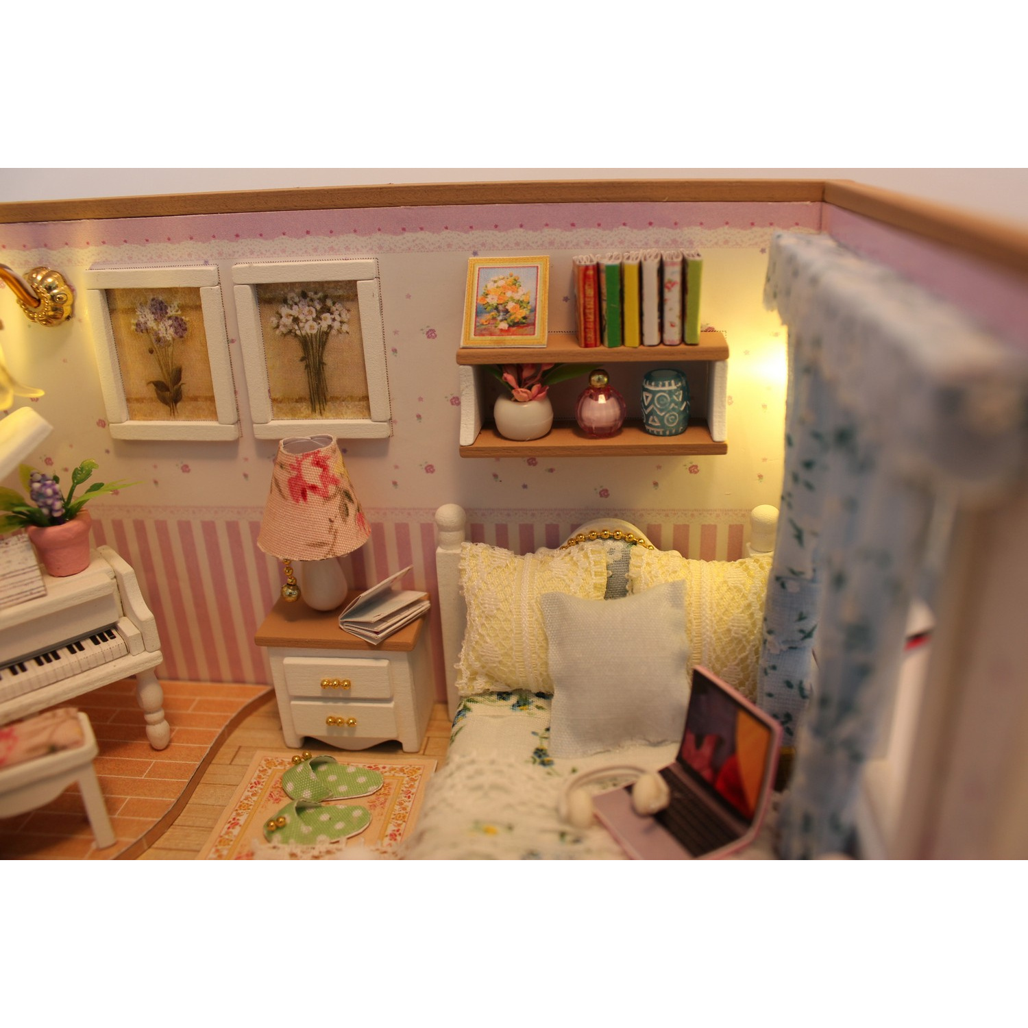 Комплектация: пылезащитный купол (оргстекло), подсветка (провода, выключатель, светодиодная лампа); деревянные основания для каркаса (стены, пол); бумага, текстиль, проволока и т.д. (для создания всех элементов декора); элементы интерьера в миниатюре; инструменты для сборки (клей 2 шт., пинцет, линейка), инструкция