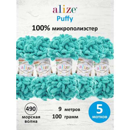 Цена на Пряжа для вязания Alize puffy 100 г 9 м микрополиэстер фантазийная плюшевая 490 морская волна 5 мотков - 1103 ₽.