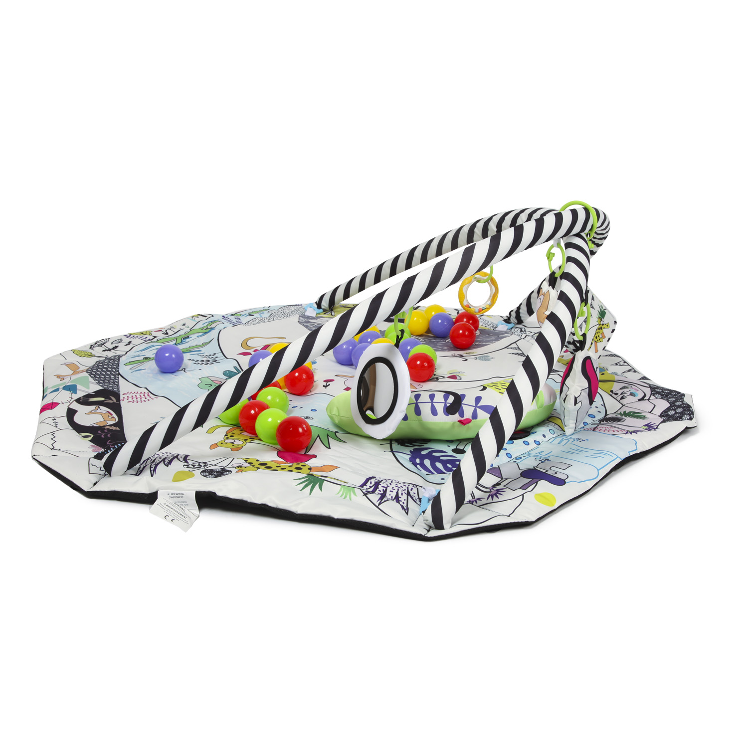 Наш уникальный развивающий коврик для малышей с игрушками выгодно отличается от других предложений. Это уникальный и самый большой набор предметов для малыша. Комплект включает в себя музыкальную игрушку, 10 цветных шариков, мягкую книжечку, погремушки, пищалку, подушечку, зеркало, мягкий матрасик и 2 дуги с креплениями. Размер коврика с разложенными бортиками 106х106 см. Ученые давно доказали, что новорожденные видят мир нечетко, словно в тумане. А полностью различают цвета только к 5 месяцам. Поэтому фокусировать взгляд младенцу легче на черном и белом цвете, ведь они являются самыми контрастными. Наш детский развивающий коврик с дугами специально разработан и выполнен в черно-белых цветах. Благодаря этому происходит развитие зрительного восприятия, умение фокусировать взгляд, остроты зрения.Так же развивающий коврик для новорожденного стимулирует развитие моторики, слуха, тактильного восприятия малыша. Коврик развивающий для малышей с игрушками подходит для детей от 0 месяцев. В это время малыш лежит на спинке и рассматривает яркие игрушки на дуге. Со временем пытается сосредоточить взгляд, а позже и дотянуться до них ручками. Детский игровой коврик стимулирует развитие моторики, слуха, тактильного восприятия малыша. Развивающий коврик для новорожденных с игрушками обеспечивает адаптацию малыша к окружающей среде. Коврик с игрушками для малыша развивает мелкую моторику, координацию движений, воображение, и пространственное мышление. Развивающий коврик для детей легкий, удобно складывается, прочный.Одна из задач для ребенка научиться лежать на животе и переворачиваться. Это залог успешного ползания и физического здоровья. Безопасные и гипоаллергенные экологичные материалы прошли тщательный гигиенический контроль. Прочная и мягкая основа защищает малыша и сохраняет тепло. Игровой коврик для новорождённых легко стирать, удобно хранить. Детский коврик для малышей имеет в комплекте: погремушки прорезыватели грызунки, безопасное зеркало, подушечку, 2 дуги с кольцами для крепления игрушек.