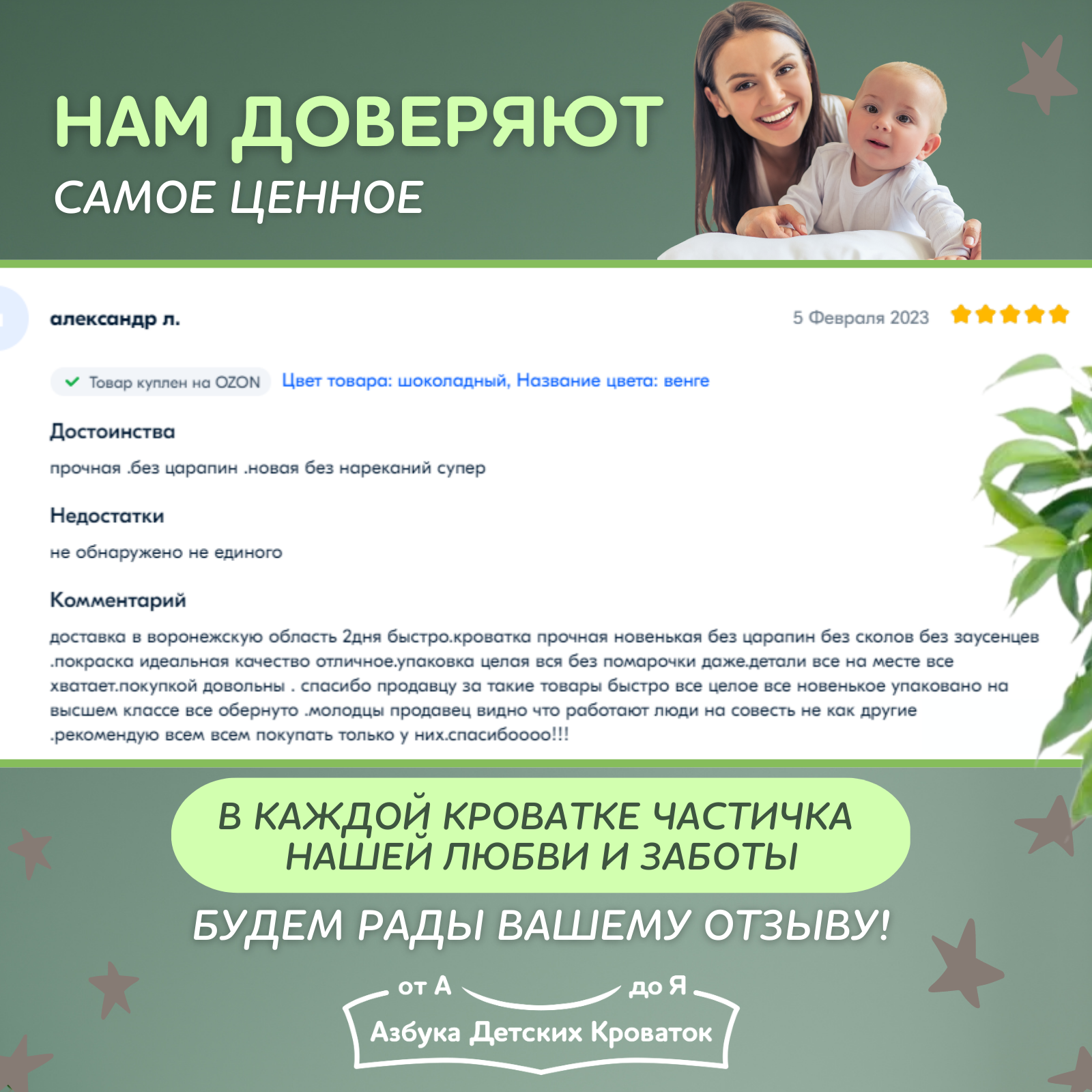 Здравствуйте, подскажите пожалуйста, её можно будет использовать, когда ребенок подрастет и научится сам слезать с кровати? Стенку можно будет убрать? Здравствуйте. Детская кроватка от 0 до 3лет. Максимальная нагрузка 20 кг. Стенка не убирается, так как может нарушиться устойчивость.Из какого дерева эта кроватка изготовлена? Ответ представителя брендаРейки, ламели и верхние планки изготовлены из березы, боковины из ЛДСПКакая высота от нижнего положения ложа до верхней планки? Высота от нижнего положения ложа до верхней планки детской кроватки Азбука Кроваток прямоугольная, без маятника (венге) составляет около 60 см.