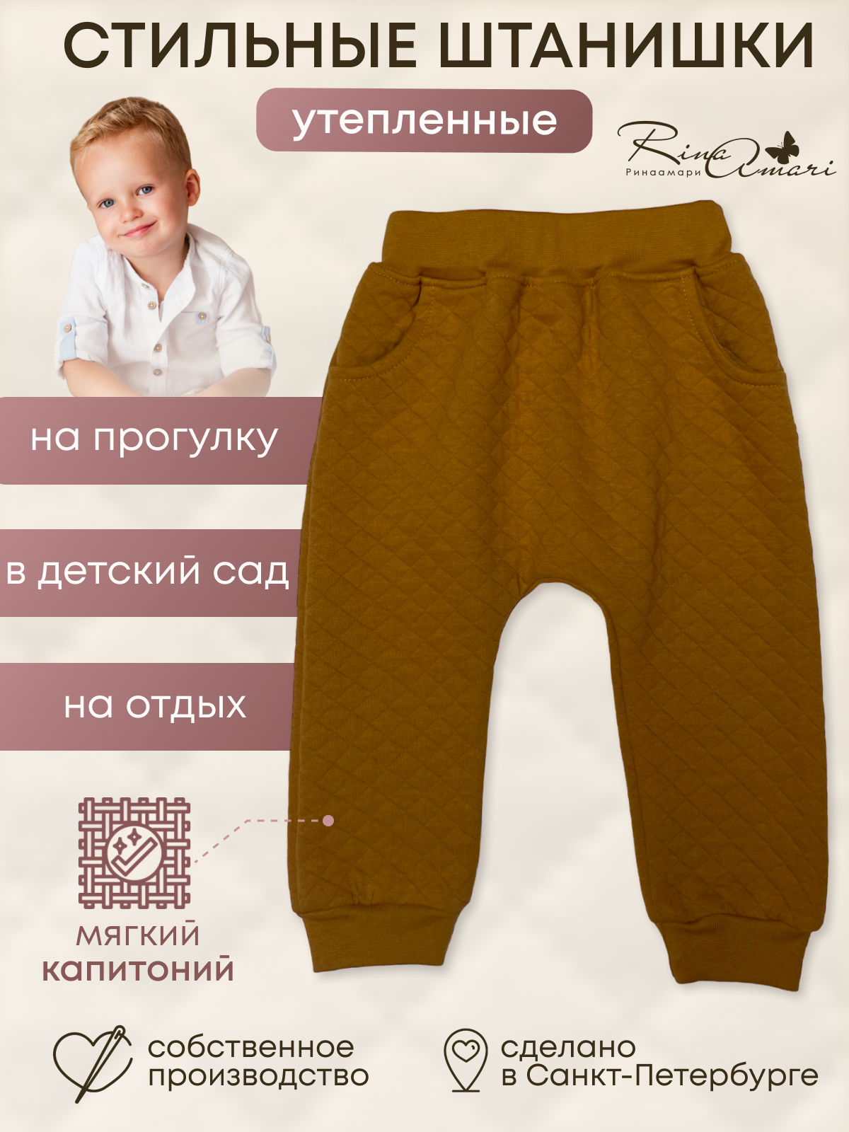 Штанишки выполнены из нежного капитония (95% хлопок, 5% полиэстер).