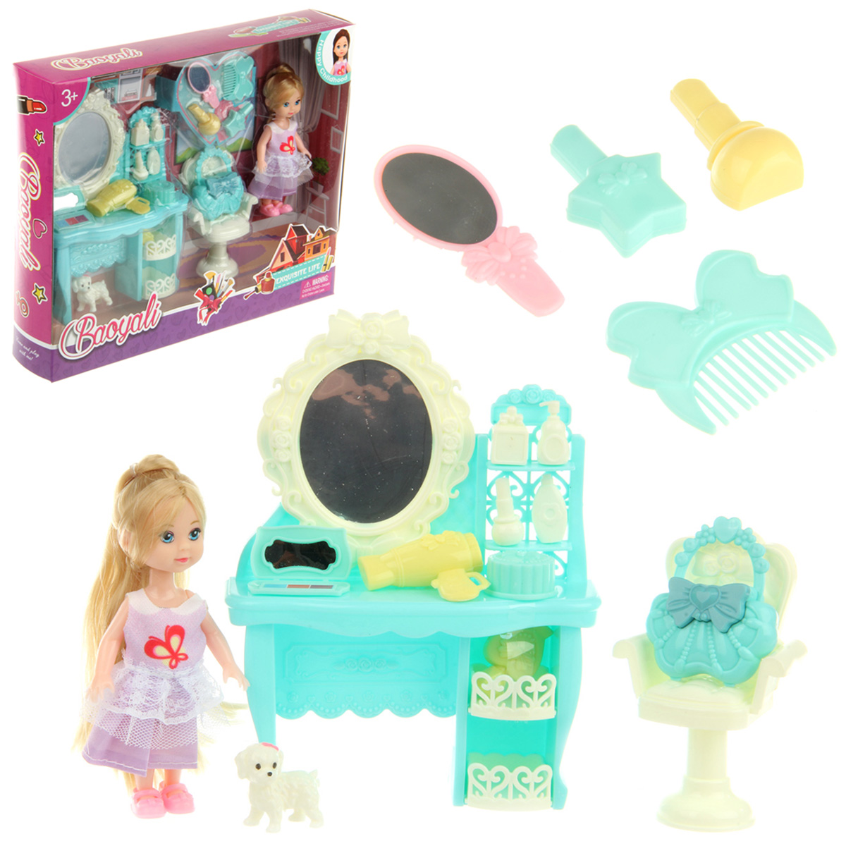 В комплекте куколка, питомец, туалетный столик, сумочка, кресло, фен, палетка, расческа, зеркало, емкость, элемент в виде звездочки, духи, 2 имитации губной помады, 3 флакончика косметических средств.