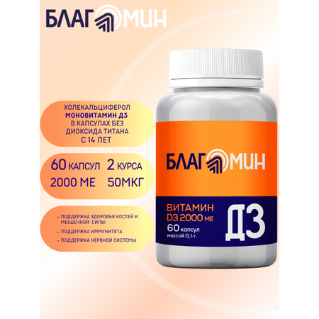 БЛАГОМИН D3 2 000 МЕ – дополнительный источник витамина Д3. В капсуле БЛАГОМИН Витамин Д3 содержится 2 000 МЕ, что составляет 1 000% от рекомендуемого уровня суточного потребления (не превышает верхний допустимый уровень потребления). Благомин Д3 способствует восполнению дефицита витамина D в организме, лучшему усвоению кальция, укреплению костей и зубок, снижению риска развития простудных заболеваний, поддержанию сердечно-сосудистой, нервной систем и репродуктивной функции организма. Разрешен к применению с 14 лет. Выпускается в желатиновых капсулах без диоксида титана. Упаковки 60 капсул хватит на 2 курса применения.