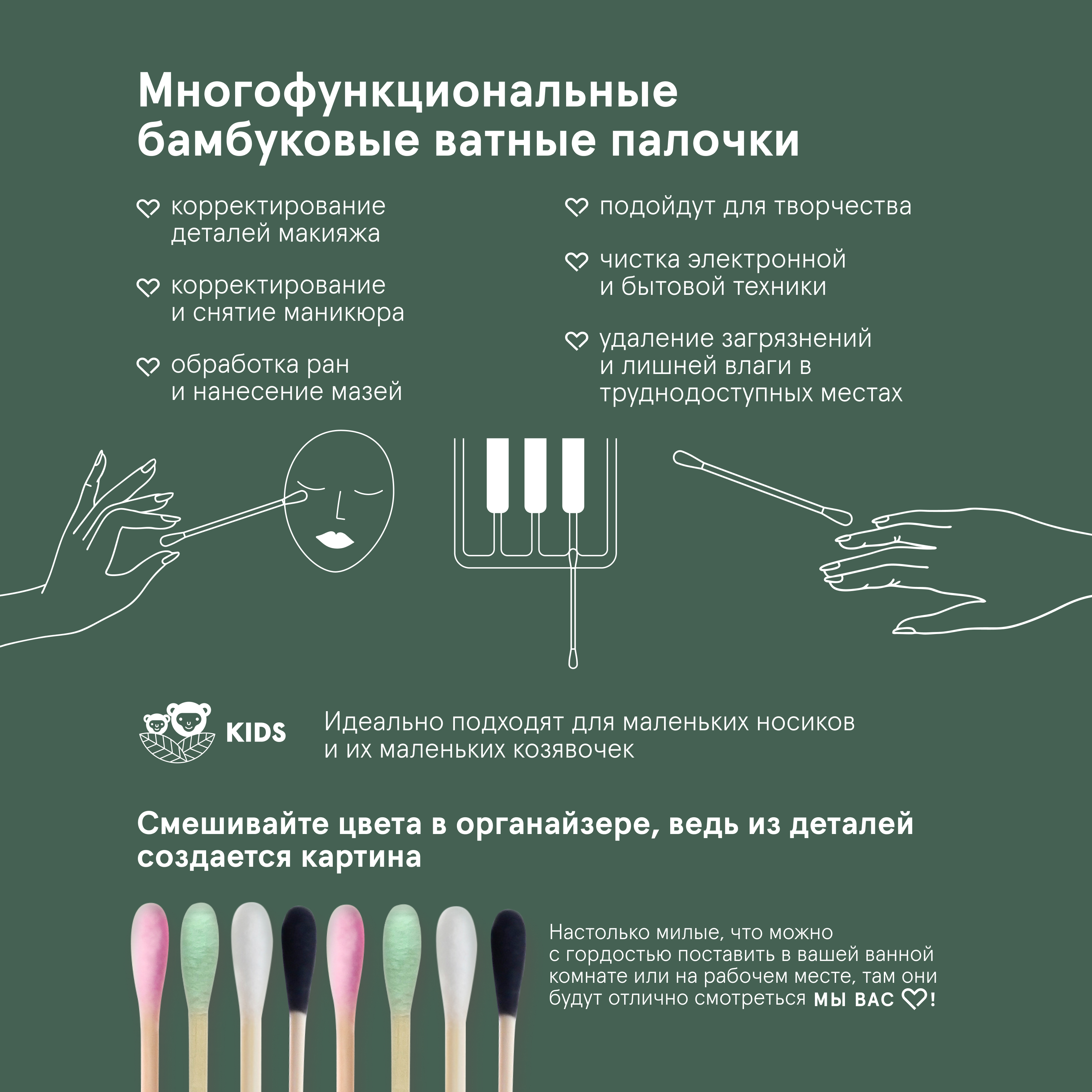 Наши ватные палочки гибкие, прочные и изготовлены из экологически чистого бамбука и натурального, пушистого хлопка.