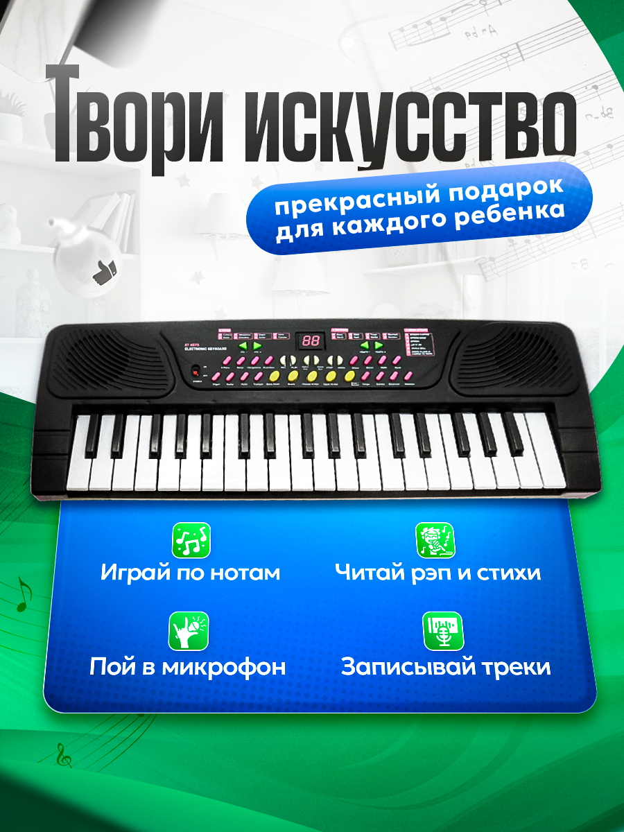 Синтезатор детский имеет компактный размер и удобный дизайн, который позволяет ребенку свободно перемещать игрушку. Клавиши и кнопки подходят для маленьких пальцев, а количество мелодий и настроек ритма позволит ребенку выбрать свою любимую композицию. Детское пианино синтезатор имеет функцию записи и воспроизведения музыки, а также функцию регулировки громкости и темпа. Игрушка прививает первые навыки усидчивости, развивает моторику рук, происходит обучение нотам, развивается слух.