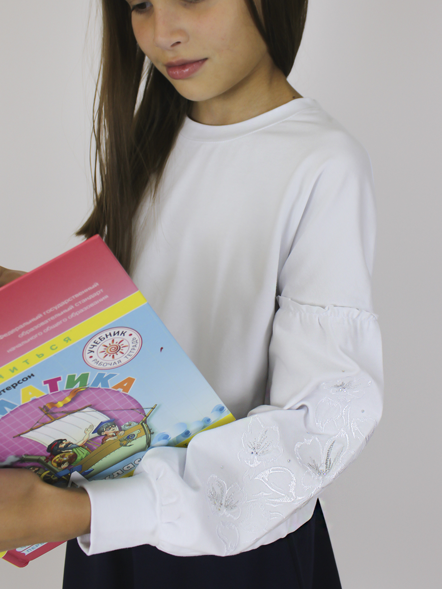 Стильный лонгслив для девочки выполнен из качественного трикотажа (95% хлопок 5% лайкра). Оригинальный рукав со сборкой, декорирован вышивкой и паетками , по низу манжет. Отличный вариант для школы и прогулок на каждый день. Классический белый цвет можно легко сочетать с любыми образами. Удобный лонгслив комфортной посадки - незаменимая модель в гардеробе.