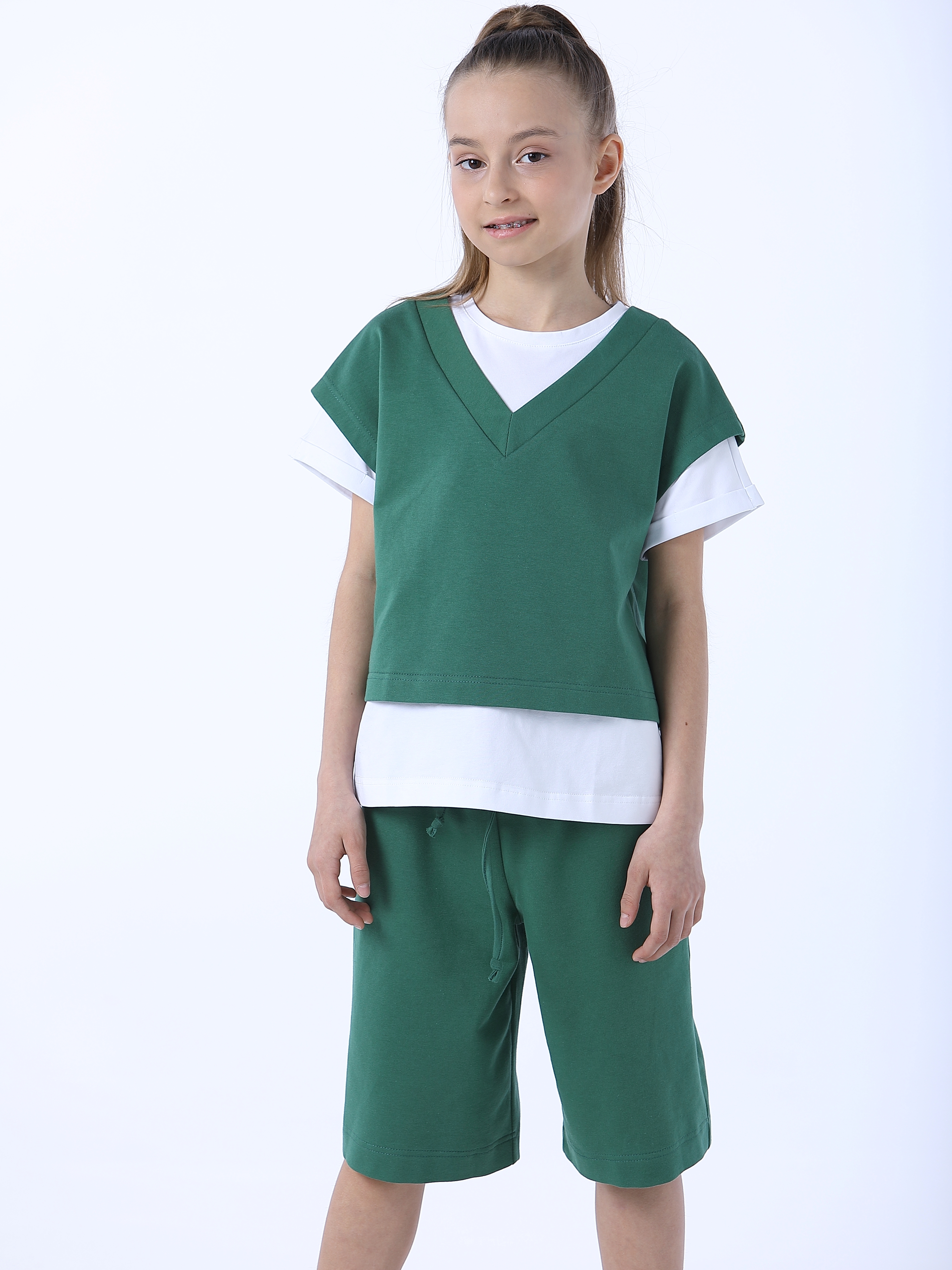 Трендовый жилет для девочки из трикотажа футер с V-образным вырезом горловины. Безрукавка для девочки, входит в коллекцию «CITY», разработанную нашим дизайнером. Своеобразие коллекции заключается в точно подобранных цветах, которые позволяют не покупать готовый костюм, а собрать его самостоятельно, исходя из своих предпочтений и вкусов. Модный тренд этого сезона: шорты + жилетка надетая поверх футболки oversize. Трикотажный жилет для девочки выполнен из футера 2х-нитки – это очень плотный трикотаж, состоящий на 95% из хлопка и 5% из эластана, который позволяет изделию не терять своей формы. Мягкий и приятный на ощупь материал на хлопковой основе имеет ряд преимуществ перед дешевой тканью: не закатывается, не растягивается, предотвращает усадку в процессе эксплуатации, обладает устойчивостью цвета после многократных стирок. Свободный и удобный крой оверсайз жилета не сковывает движения, позволяя подростку быть активным. А натуральный дышащий материал превратит летнюю жилетку для девочки в любимый элемент гардероба в жаркую погоду. ТМ "LADNO" – это сертифицированная детская одежда российского производства для девочек.