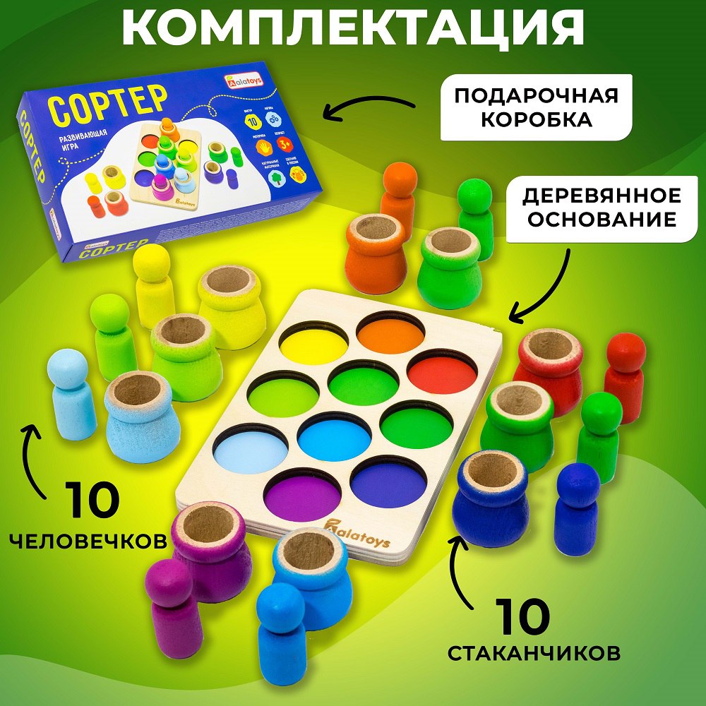 Сортер деревянный выполнен таким образом, что каждый стаканчик имеет свой уникальный оттенок. Это позволит малышу легко проводить сортировку и одновременно изучать их цвета.