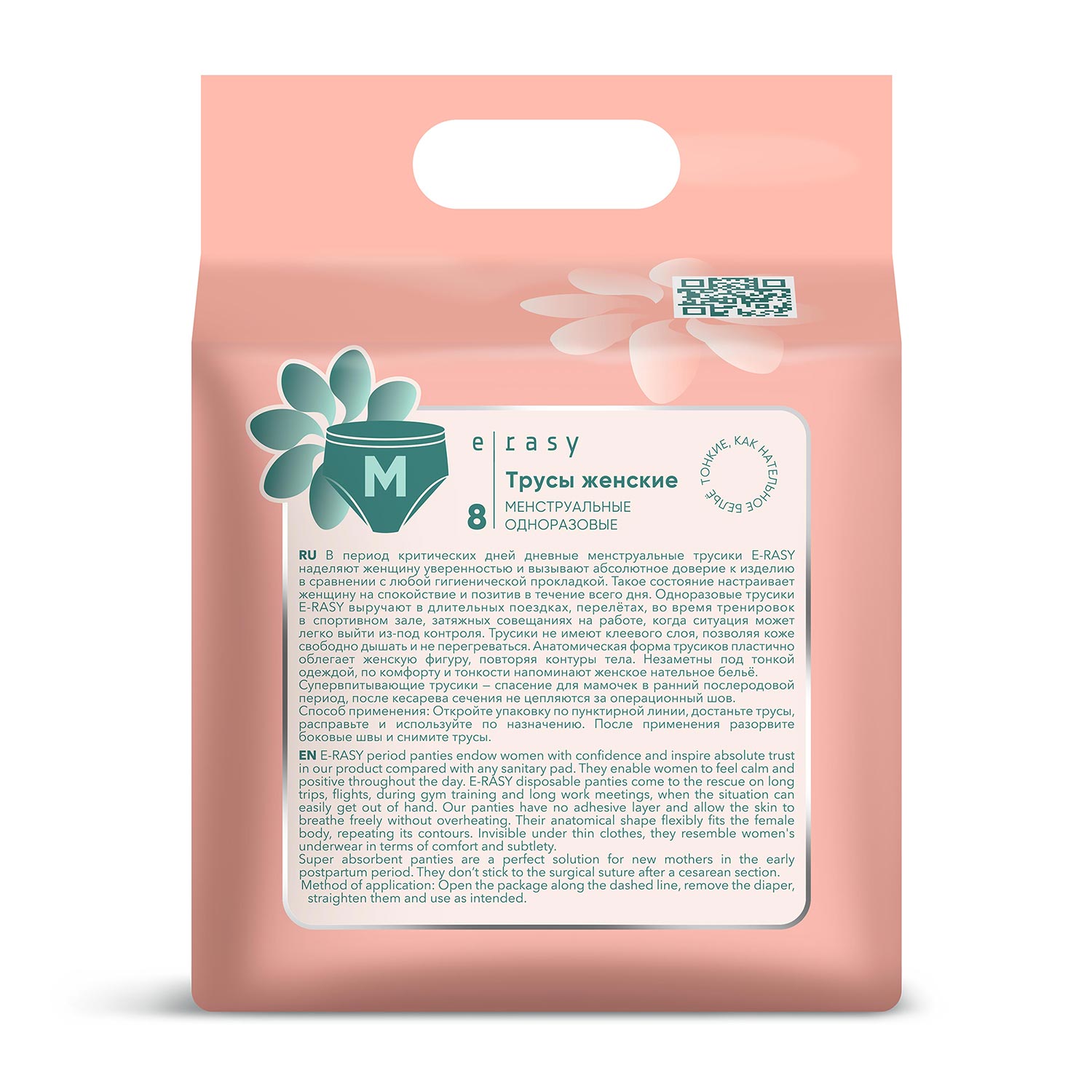 В период критических дней дневные менструальные трусики E-RASY наделяют женщину уверенностью и вызывают абсолютное доверие к изделию в сравнении с любой гигиенической прокладкой. Такое состояние настраивает женщину на спокойствие и позитив в течение всего дня. Одноразовые трусики E-RASY выручают в длительных поездках, перелётах, во время тренировок в спортивном зале, затяжных совещаниях на работе, когда ситуация может легко выйти из-под контроля. Трусики не имеют клеевого слоя, позволяя коже свободно дышать и не перегреваться. Анатомическая форма трусиков пластично облегает женскую фигуру, повторяя контуры тела. Незаметны под тонкой одеждой, по комфорту и тонкости напоминают женское нательное бельё.
