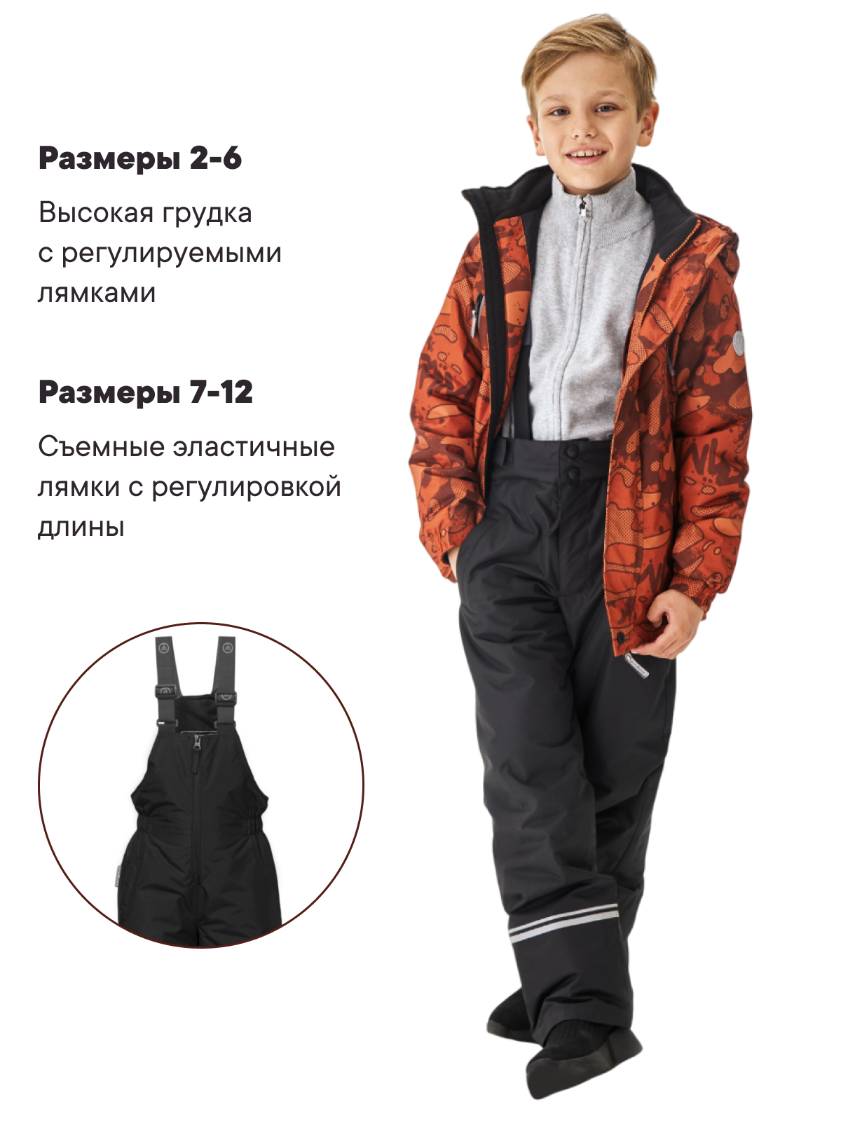 Теплый комплект отлично подойдет для прохладной весенней и осенней погоды, а также ранней зимы. Мембранная ткань защитит от дождя и ветра, имеет грязеотталкивающий эффект. Стильный дизайн поможет выделиться в толпе, как малышу, так и мальчику подростку.