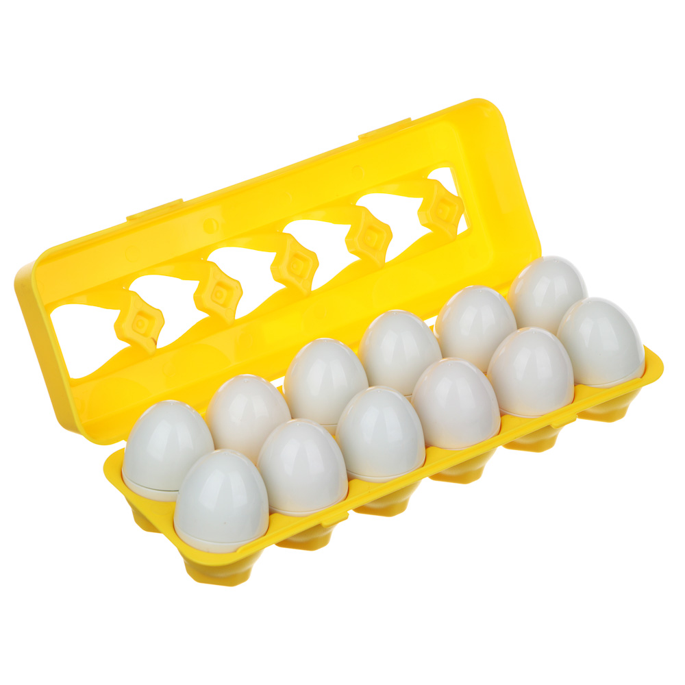 Сортер представляет собой набор разноцветных деталей-половинок яиц. Задача ребёнка — к каждой половинке найти свою пару!