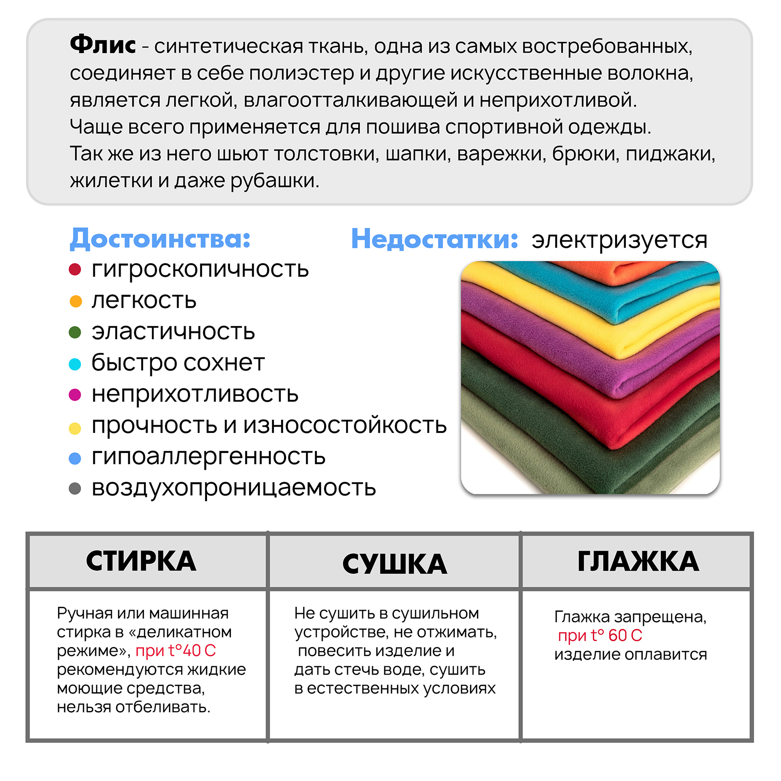 Благодаря специальной обработке флис не скатывается и не электризуется.