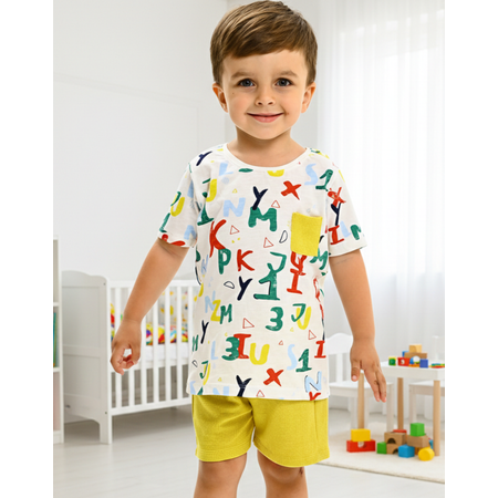 Комплект футболка и шорты для мальчика ЦВЕТ : ФУТБОЛКА МОЛОЧНЫЙ С ПРИНТОМ,ШОРТЫ ЖЁЛТЫЙ . Футболка выполнена из экологичной ХЛОПКОВОЙ ткани , свободного кроя, вырез горловины округлый, рукав короткий, на груди кармашек.Шорты, ткань ВАФЕЛЬНОЕ ПОЛОТНО средней плотности,легкая, приятная к телу, хорошо пропускает воздух. На пояске имеется резинка и шнурок.Есть ширинка-обманка с пуговицами. Футболка и шорты для девочки легкие, одежда для новорожденных приятная к телу, комплект летний для девочек хорошо пропускает воздух. Натуральный хлопок футболки и шорт для малышей обеспечит комфорт ребенку во время летних прогулок или носки дома, в детском саду. Комплект футболка и шорты прекрасный подарок.
