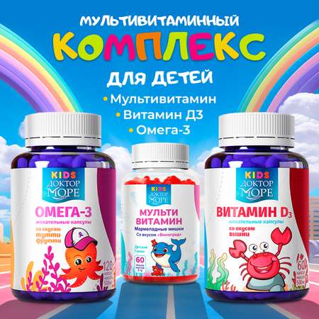 Витамин Д 3 - 1 банка - капсулы 60 шт., Омега-3 с витаминами Д3, Е,А, (жевательные) - 1 банка - капсулы 120 шт., Мультивитамины мармеладные мишки Гамми - 1 банка - капсулы 60 шт.
